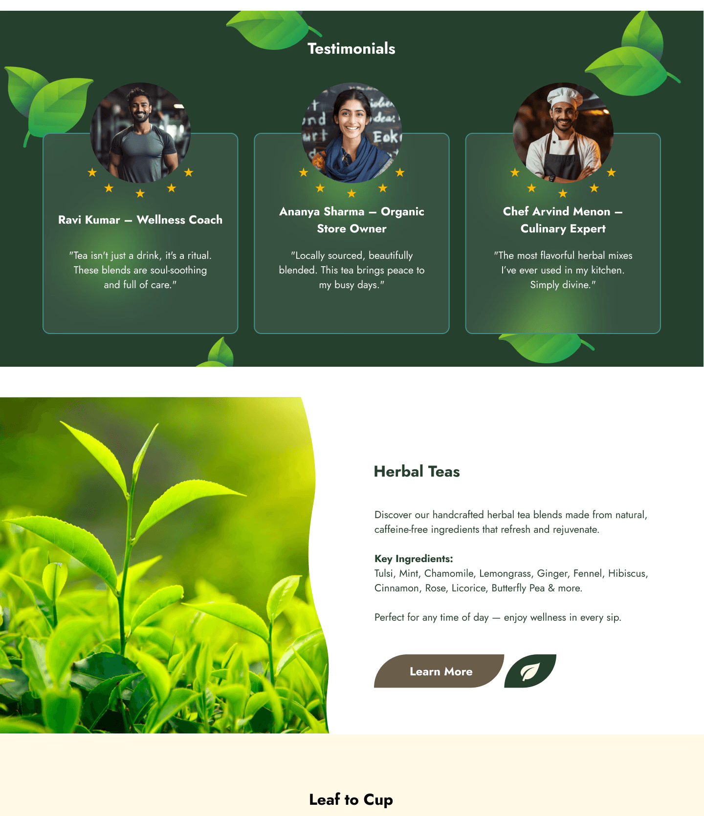 Research & Analysis: We began by studying customer behavior, organic tea trends, and competitor websites. Interviews and surveys with target users helped us understand their expectations regarding purity, sustainability, and product accessibility.